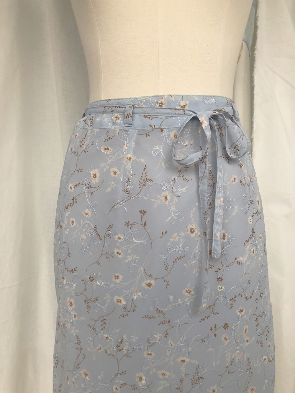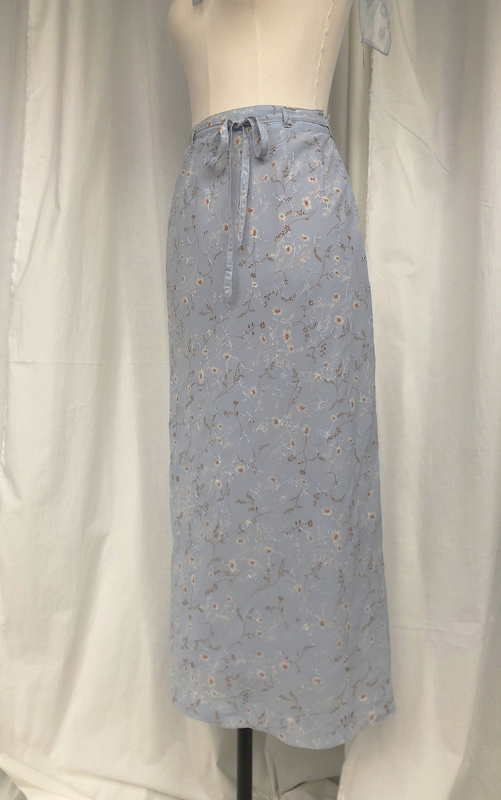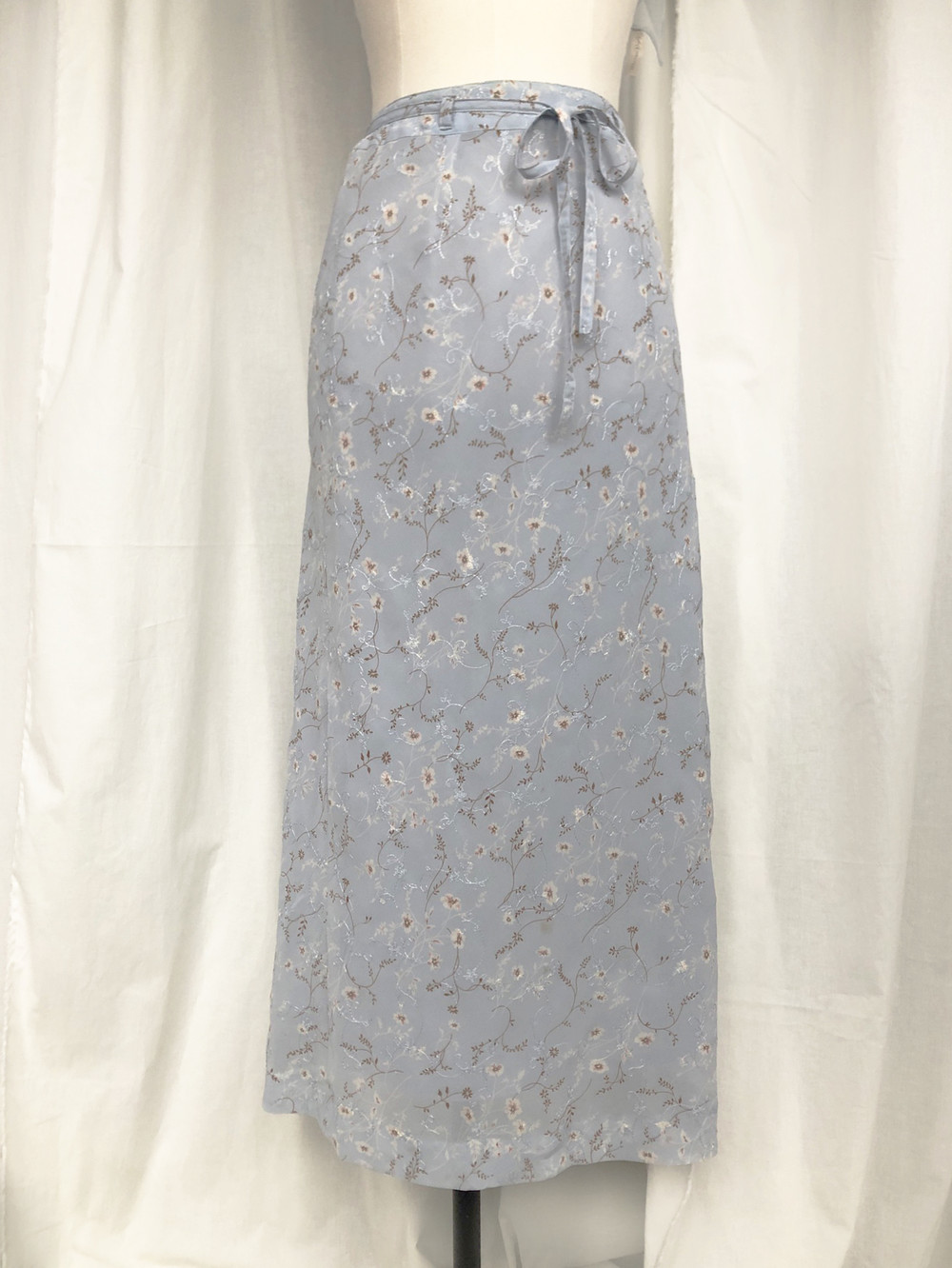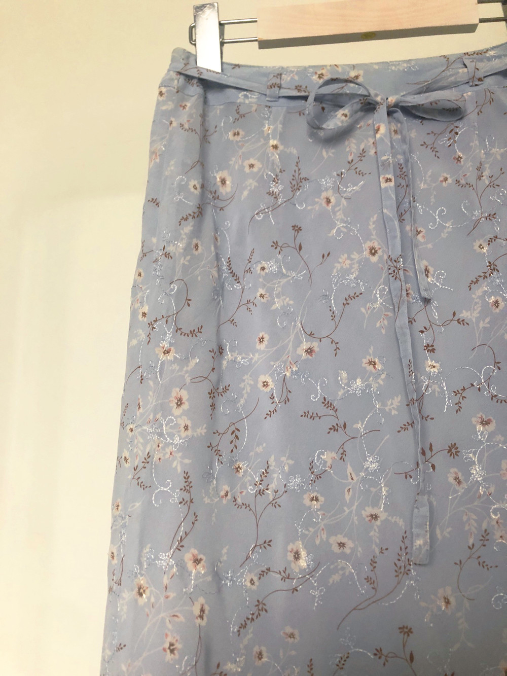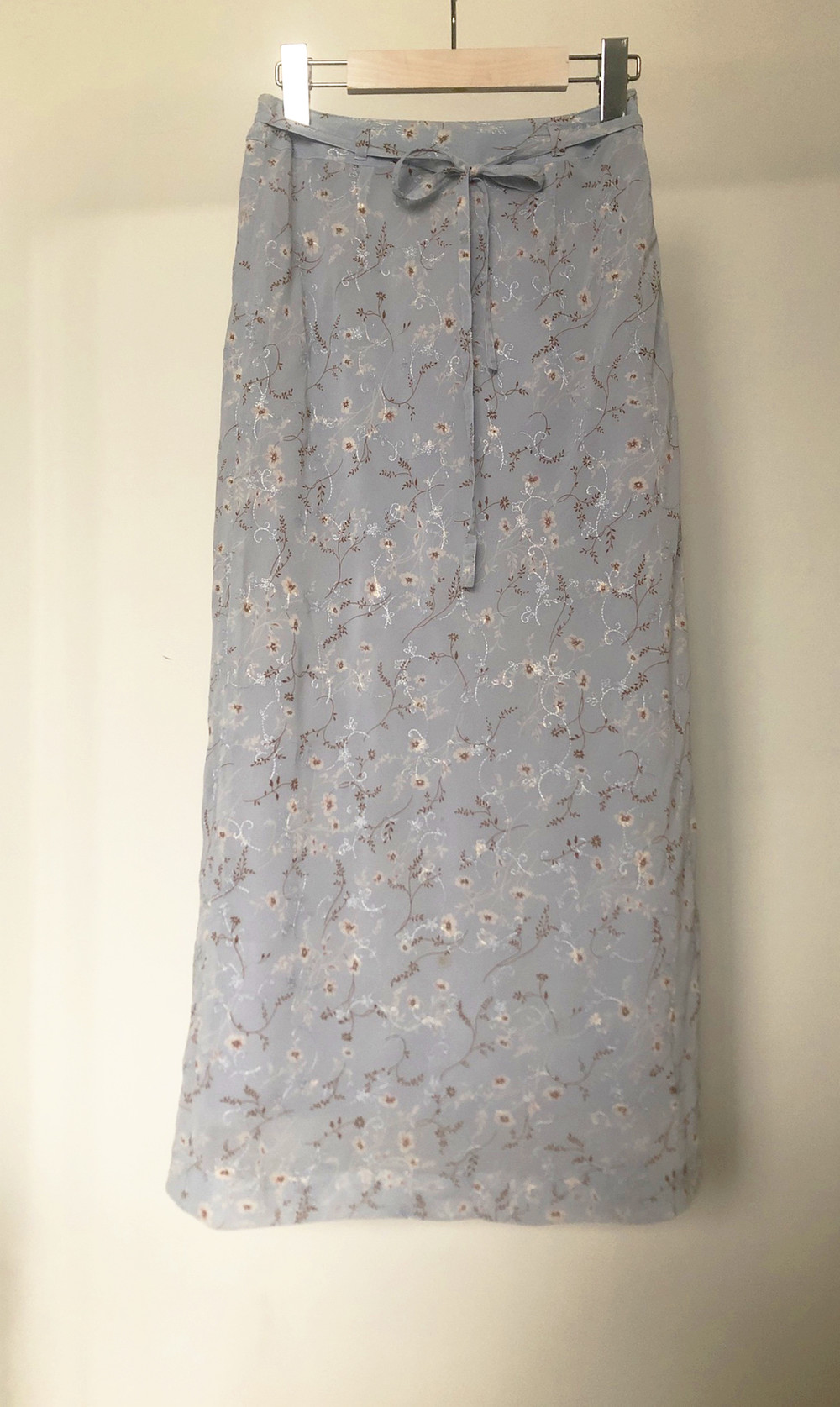 차분한 블루그레이빛 위의 자수가 얹어진 예쁜원단, 슬림한 허리의 롱스커트.