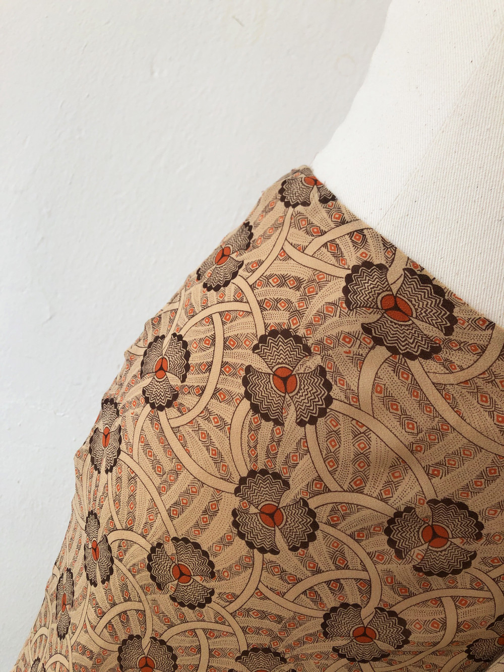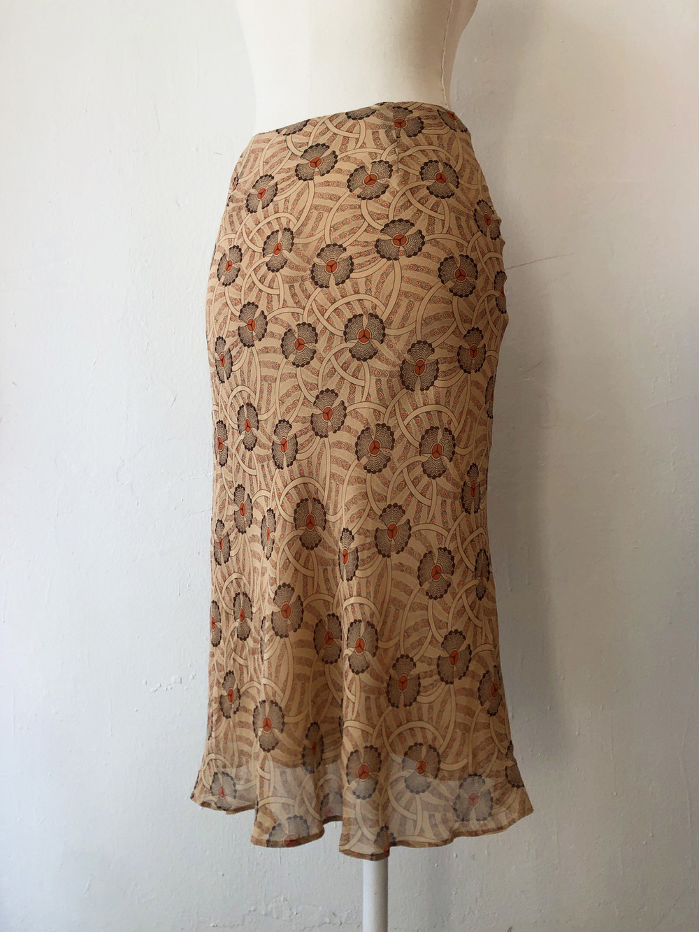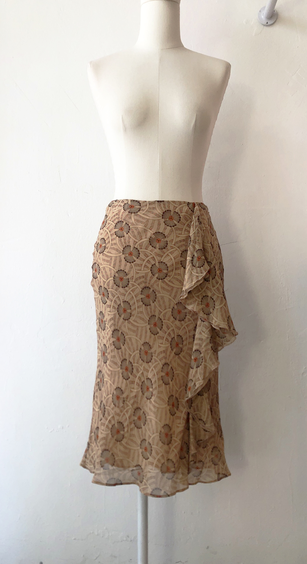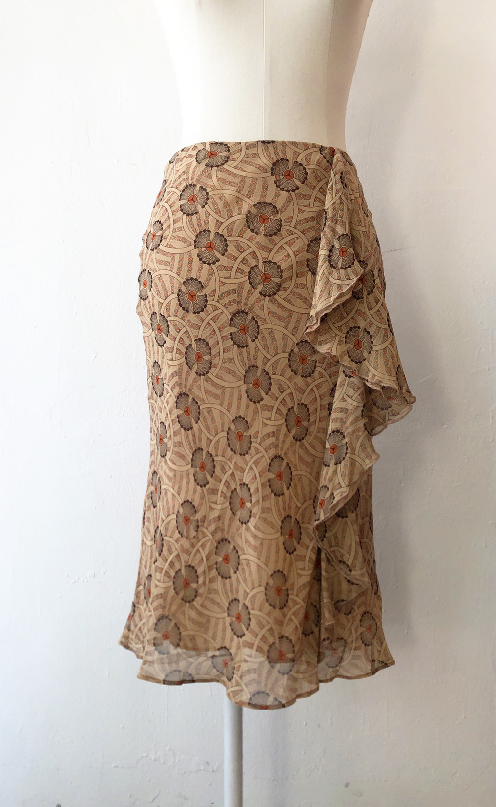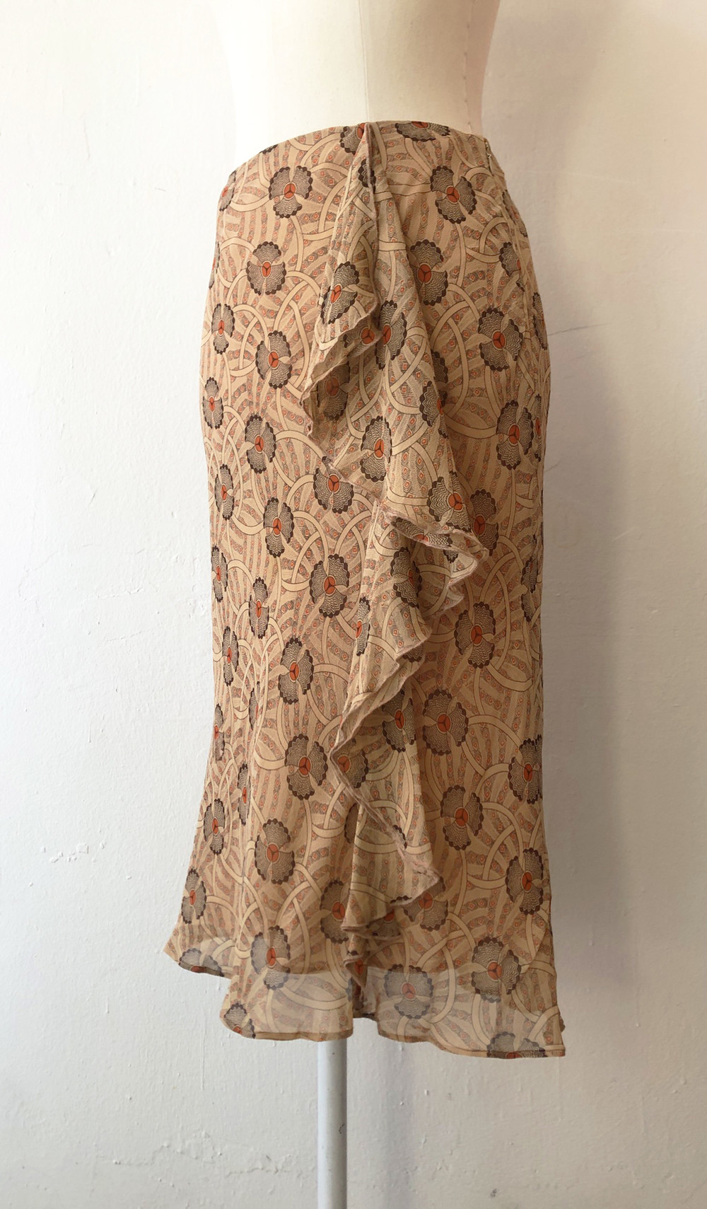 야들한 실크소재의 베이지톤의 오리엔탈한 프린트가 멋진 프릴스커트.