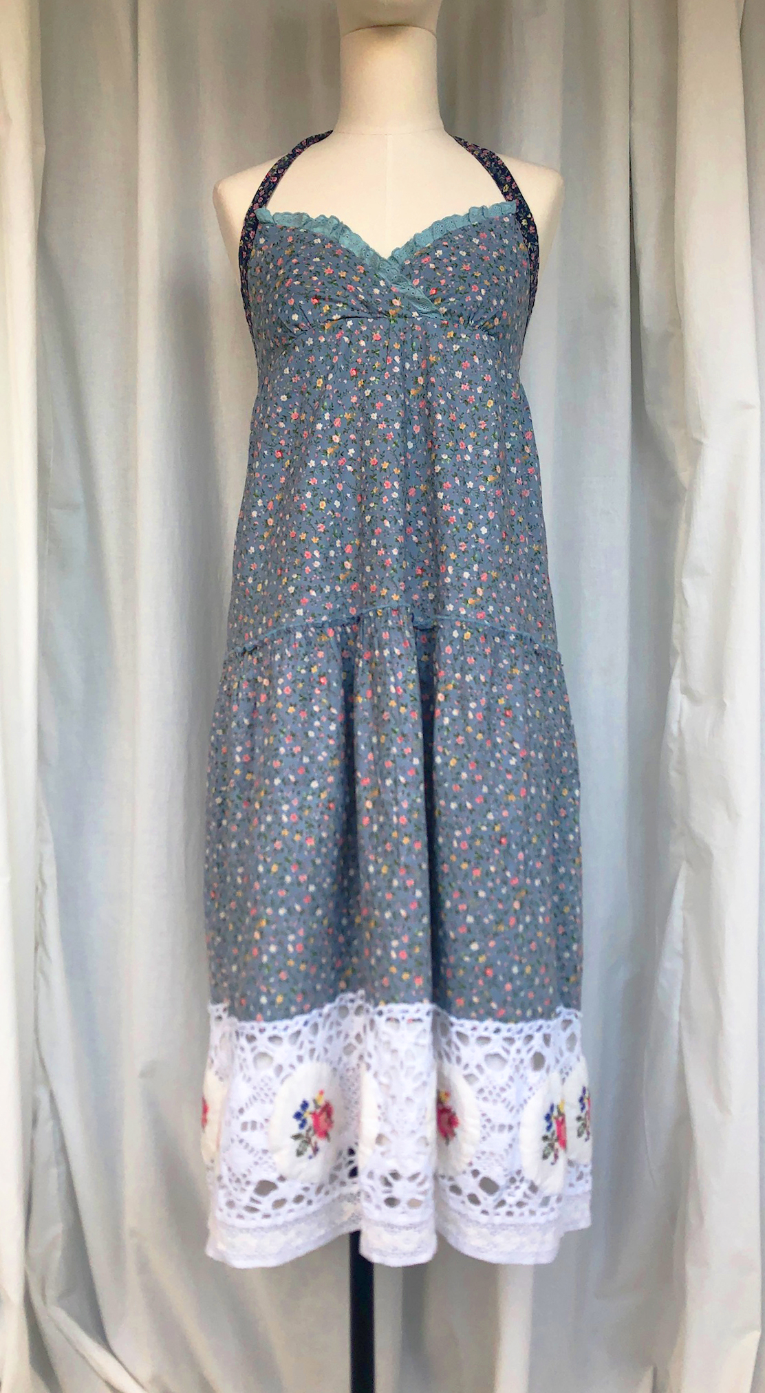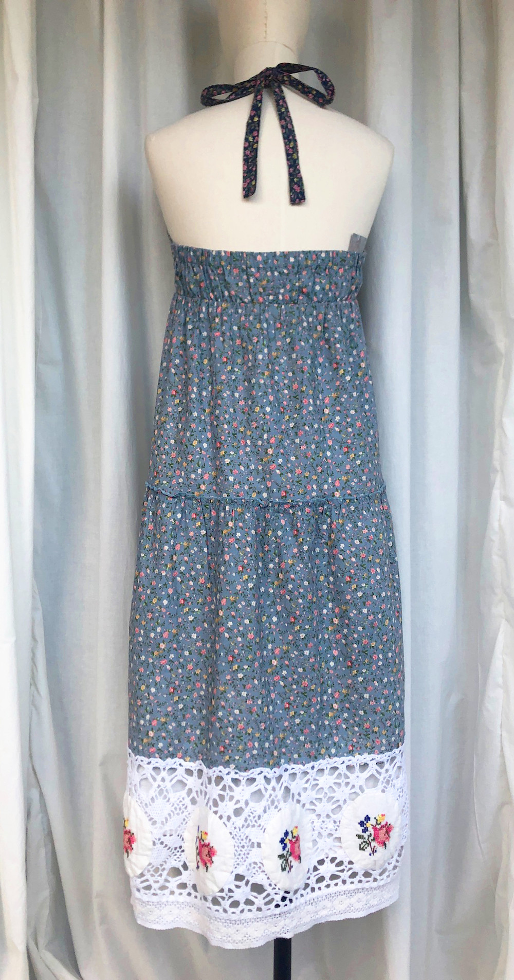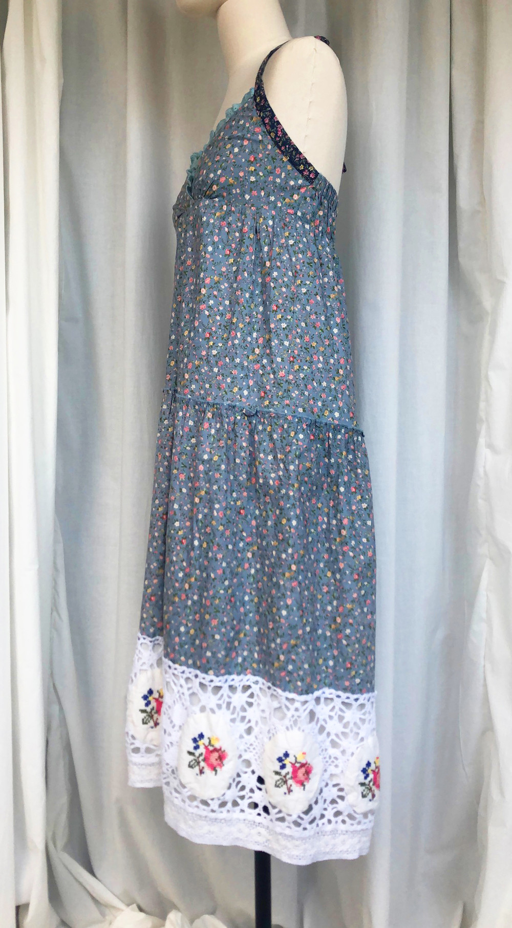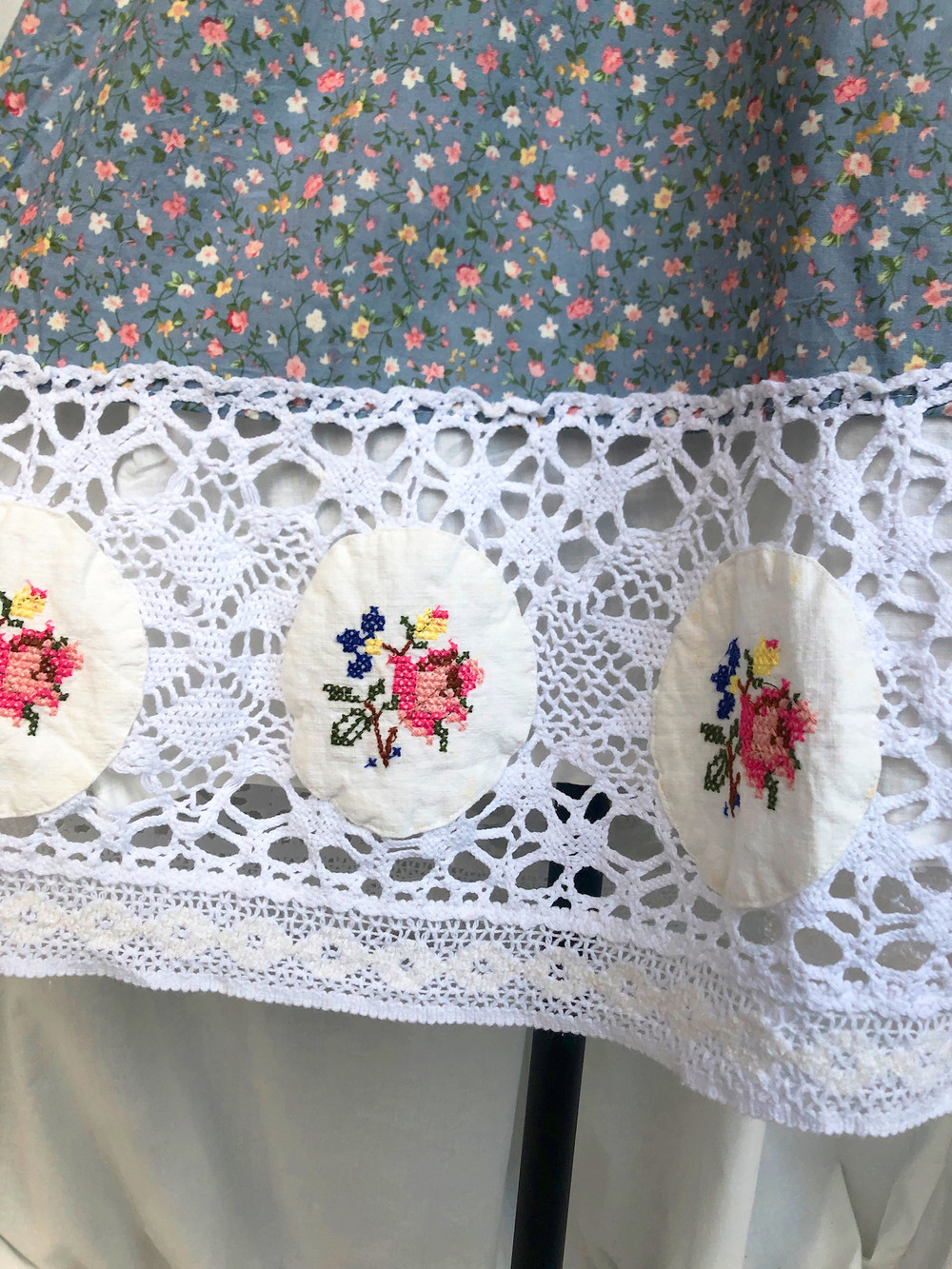 밑단의 도톰한 면 레이스위의 패치워크 위의 십자수로 매우 고급스러워요.