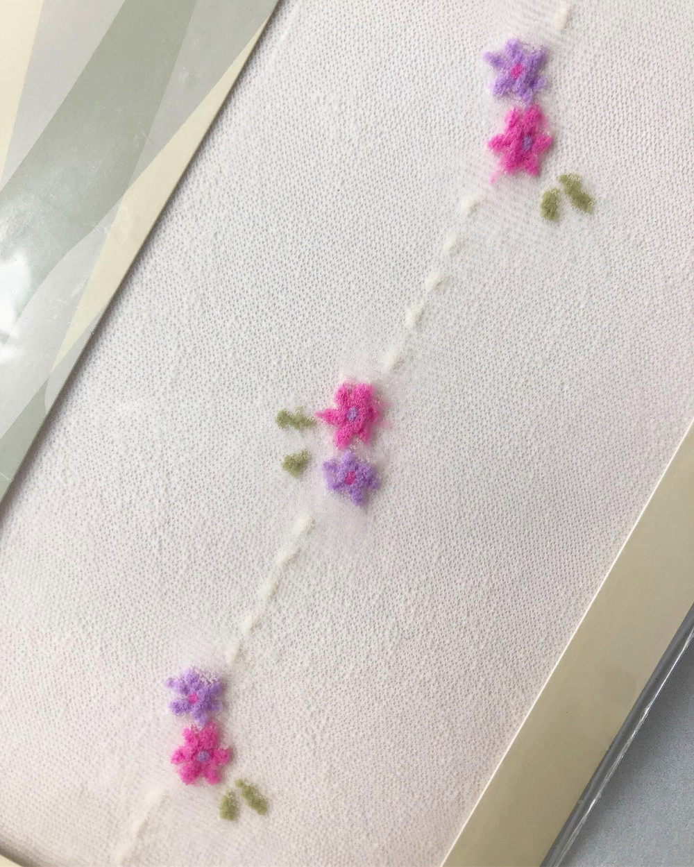 YU SOKUBITO 의 다리 옆라인에 작고 귀여운 핑크보라꽃이 수놓인 아이보리빛 스타킹